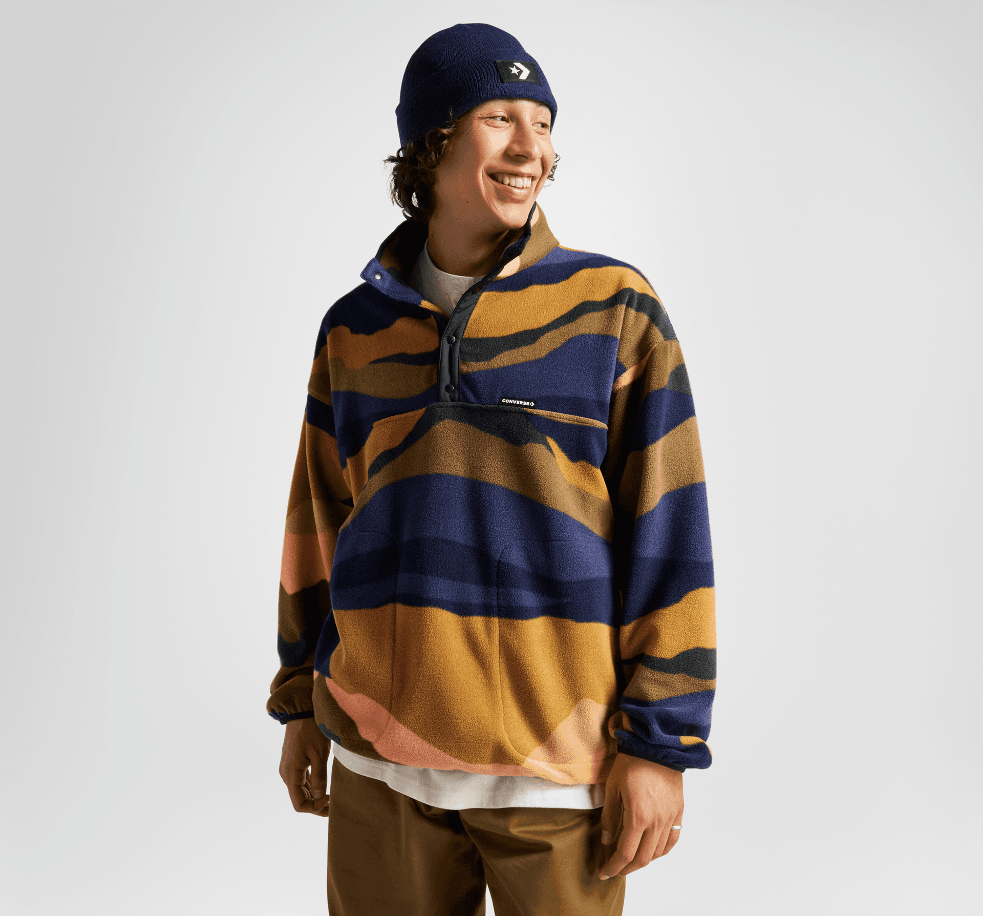 Ta polarowa bluza zainspirowana górskim krajobrazem zapewni Ci komfort nie tracąc przy tym oryginalnego stylu. Elastyczne wykończenia na rękawach i dolnym brzegu, pomogą utrzymać ciepło, a boczne kieszenie są gotowe, aby ochronić Twoje dłonie przed nieprzyjemnym wiatrem.