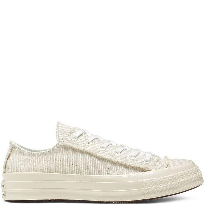 Stworzone z myślą o przyszłości. W modelu Chuck 70 wprowadziliśmy przyjazne dla środowiska zmiany w konstrukcji i wykorzystanych materiałach. Płócienna cholewka jest wykonana w 40% z recyklingowanej bawełny pochodzącej z dotychczas niewykorzystywanych skrawków z naszej fabryki. Klasyczna gumowa osłona, dodatkowa amortyzacja i podeszwa zewnętrzna z gumy z recyklingu – oto zalety butów Chuck 70.