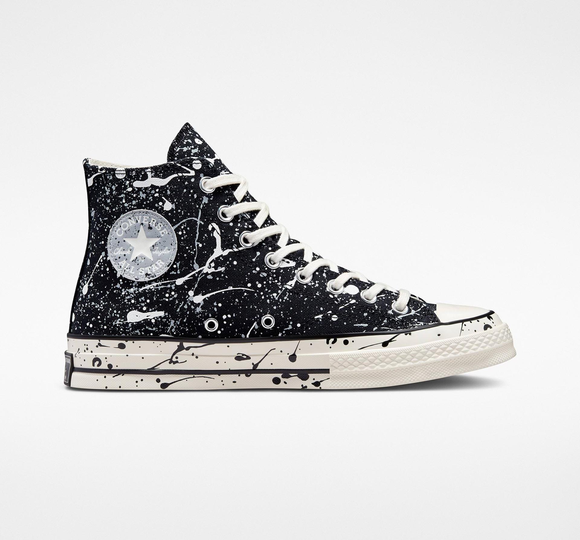 But z wysoką płócienną cholewką z nadrukiem imitującym rozpryski farby