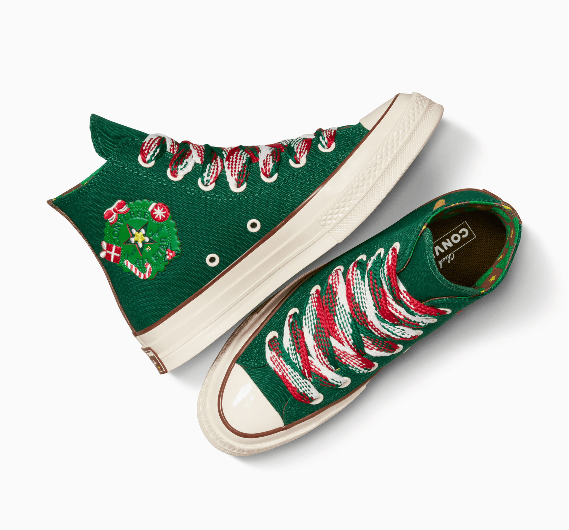 Najlepszy prezent, jaki możesz podarować swojej garderobie na Święta? Te Chuck 70 utrzymane w czerwieni i zieleni, dodadzą świątecznego charakteru każdej stylizacji. To sezon na dzianiny, więc nasi magiczni pomocnicy z warsztatu Converse dorzucili odpinaną dzianinową skarpetę, która zmieni każdy strój w zimowy cud. A czym są Święta bez słodyczy? Ulubieniec wszystkich, piernikowy ludzik, dołącza do zabawy, a ponieważ Ty (i Twoja szafa) byliście w tym roku bardzo grzeczni, pojawia się dwukrotnie: jako odpinana dzianinowa maskotka i grafika z boku. Na deser? Dwie pary sznurowadeł, dzięki którym możesz udekorować swoje Chuck, jak tylko dusza zapragnie!