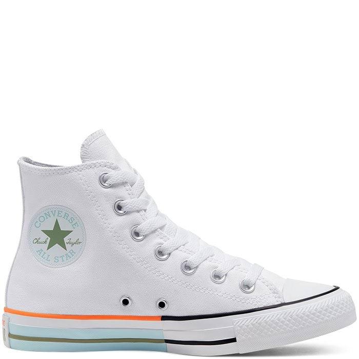 Buty Chuck Taylor All Star są niekwestionowaną ikoną codziennego stylu od 1917 roku. Nikomu nie trzeba już chyba specjalnie przedstawiać kultowych detali prosto z koszykarskiego parkietu, takich jak płócienna cholewka, podeszwa zewnętrzna z bieżnikiem w romby i oczywiście naszywka Chuck Taylor na kostce. Podeszwa środkowa o kontrastujących kolorach z jasnymi paskami przyciąga wzrok.