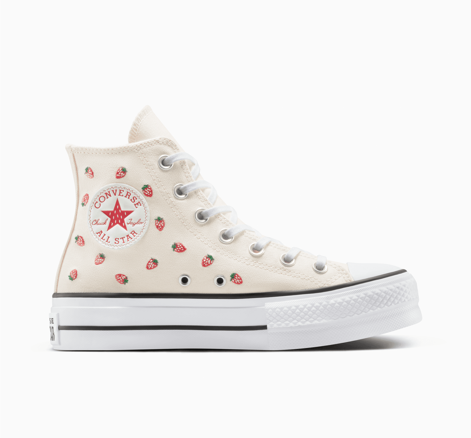 Świeże nadruki dla Twoich platform Chucks. Dzięki tym odważnym truskawkowym grafikom zachowasz ducha słonecznego dnia przez cały rok.