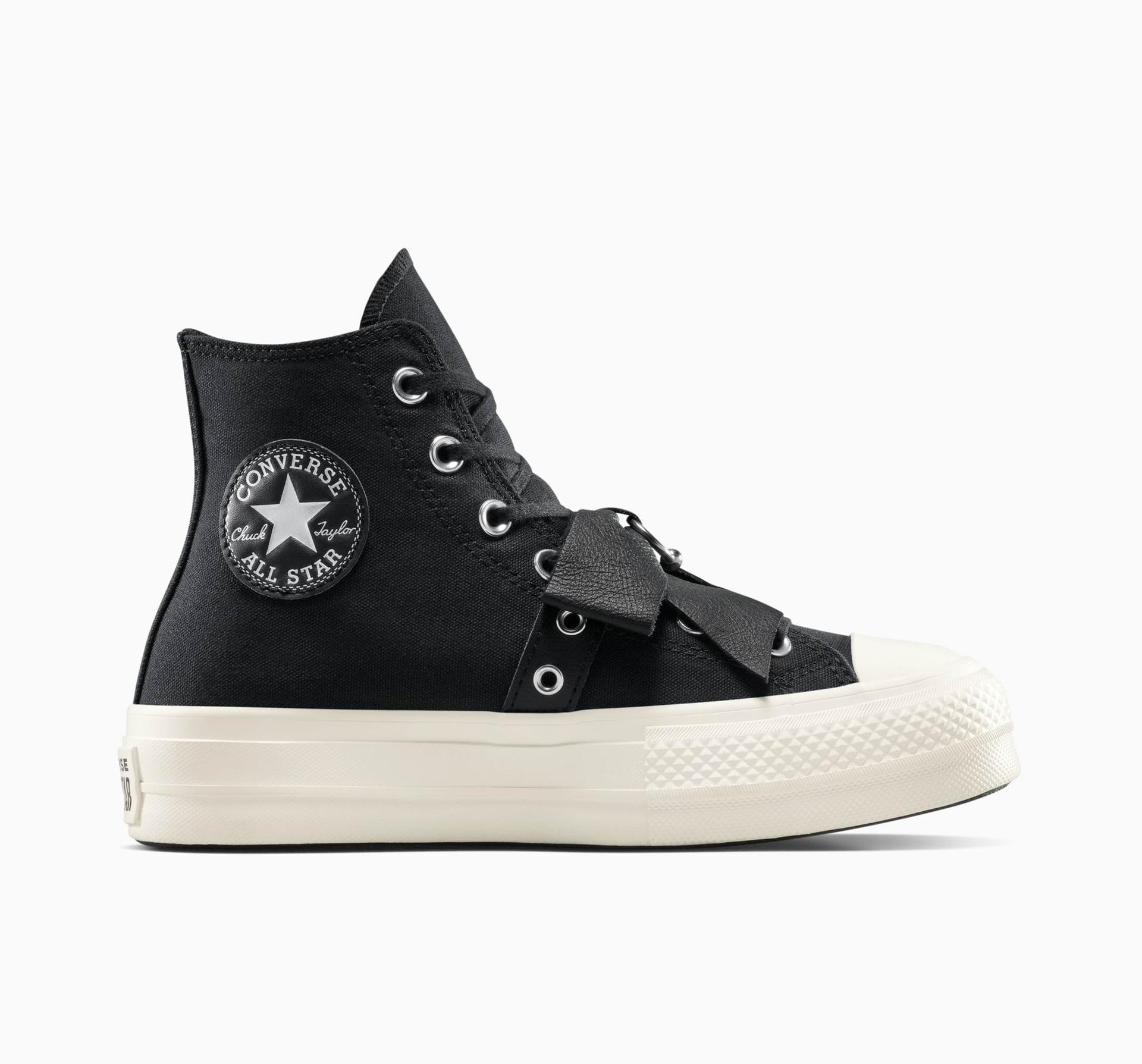 Pokaż swoją punkową buntowniczą naturę dzięki czarnemu jak smoła obcasowi na platformie i kolczykom w skórzanych kokardkach.