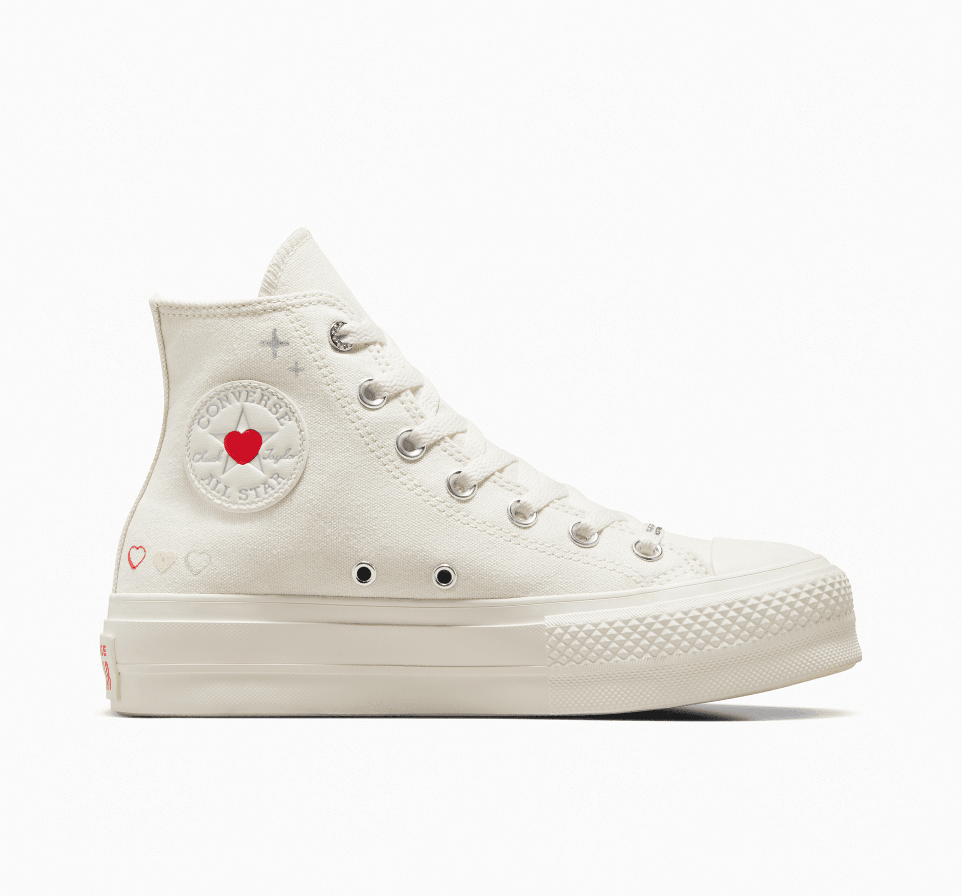 Te podwyższone Chuck 70 z małymi serduszkami i metalicznymi detalami, wyglądają jak list miłosny z lat 2000. Serce wewnątrz naszywki na kostce zapewni Ci styl, który z pewnością wzbudziłby zazdrość u samego Kupidyna.