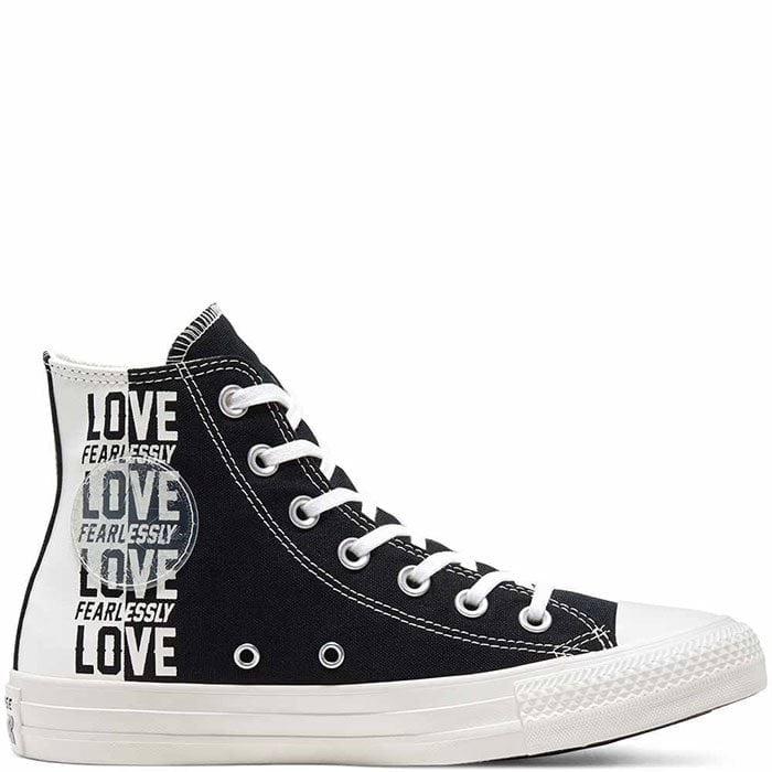 Buty typu high top Chuck Taylor All Star są niekwestionowaną ikoną codziennego stylu od 1917 roku. Nikomu nie trzeba już chyba specjalnie przedstawiać kultowych detali prosto z koszykarskiego parkietu, takich jak płócienna cholewka, podeszwa zewnętrzna z bieżnikiem w romby i oczywiście naszywka Chuck Taylor na kostce. Cholewka z gładkiego płótna ozdobiona napisem z budującym przesłaniem „LOVE FEARLESSLY”.