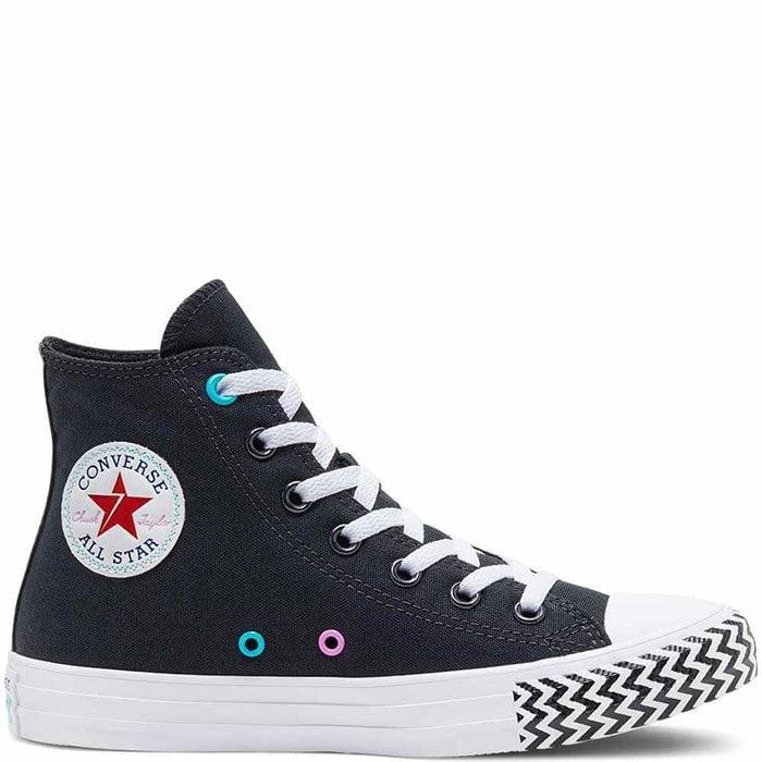 Buty typu high top Chuck Taylor All Star są niekwestionowaną ikoną codziennego stylu od 1917 roku. Nikomu nie trzeba już chyba specjalnie przedstawiać kultowych detali prosto z koszykarskiego parkietu, takich jak płócienna cholewka, podeszwa zewnętrzna z bieżnikiem w romby i oczywiście naszywka Chuck Taylor na kostce. Kultowe buty, inspirowane wyrazistymi wzorami noszonymi na boiskach w latach 90., zyskały archiwalną grafikę z motywem VLTG na osłonie palców oraz kolorowe przelotki. Wkładka OrthoLite zapewnia komfort