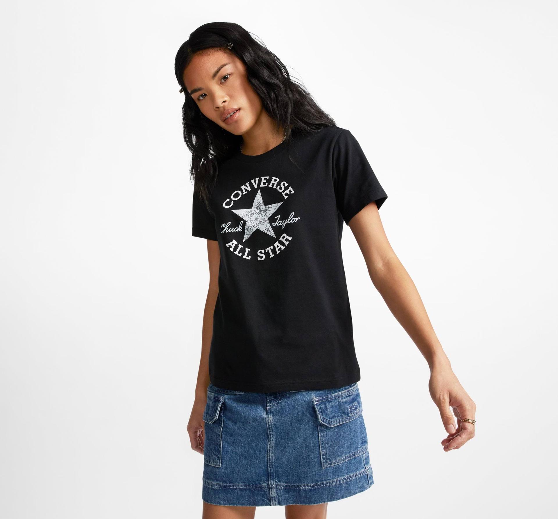 Koszulka w klasycznym kroju, wykonana z miękkiej bawełnianej dzianiny, która jest gotowa, by towarzyszyć Ci w codziennych wyzwaniach, przynosząc ze sobą niepowtarzalny styl Chuck Taylor. Oryginalne logo All Star otrzymało letni, kwiatowy update, który idealnie wpisuje się w aktualne trendy. To idealna propozycja dla tych, którzy cenią sobie wygodę i unikalny design w jednym.