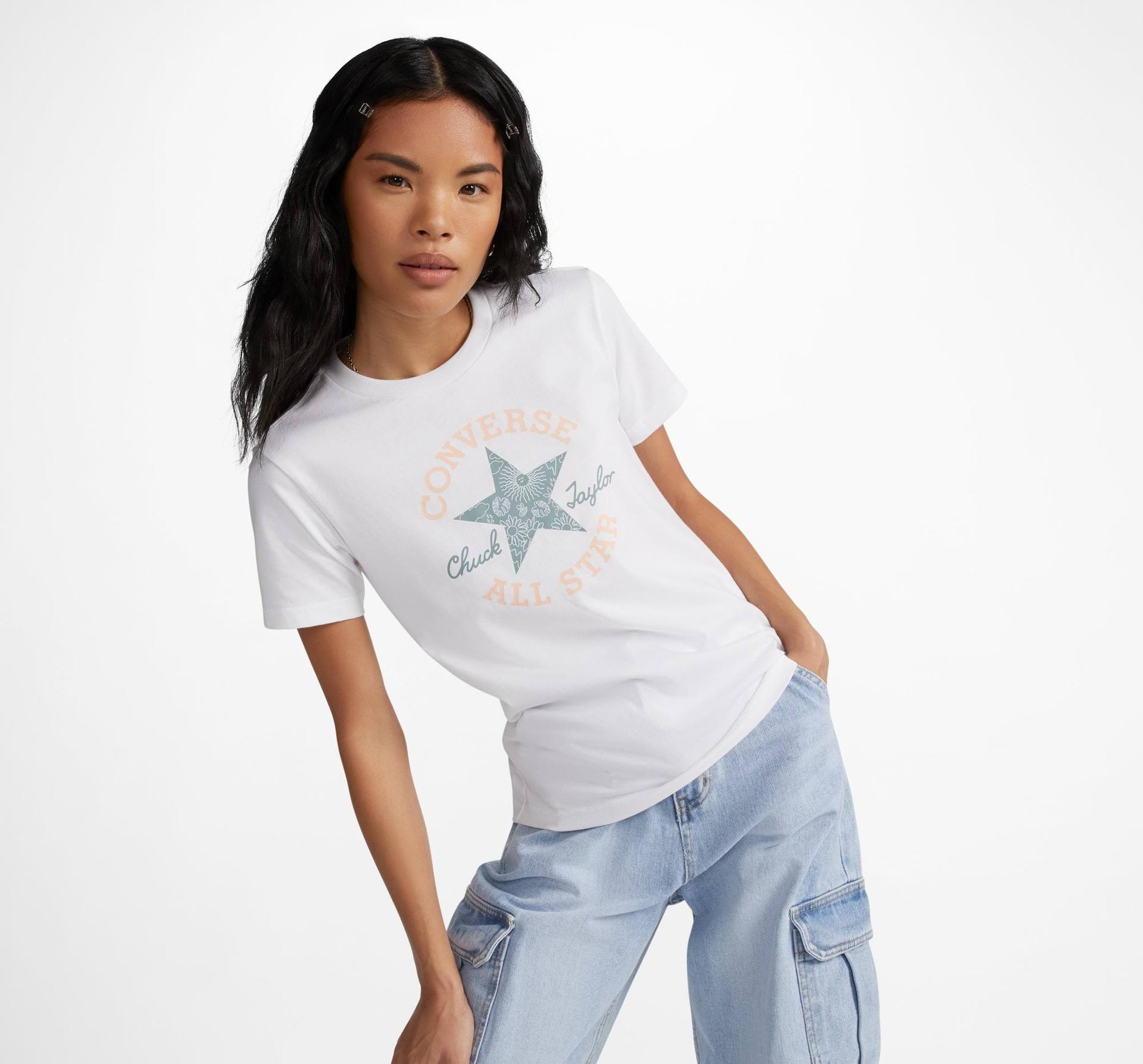 Koszulka w klasycznym kroju, wykonana z miękkiej bawełnianej dzianiny, która jest gotowa, by towarzyszyć Ci w codziennych wyzwaniach, przynosząc ze sobą niepowtarzalny styl Chuck Taylor. Oryginalne logo All Star otrzymało letni, kwiatowy update, który idealnie wpisuje się w aktualne trendy. To idealna propozycja dla tych, którzy cenią sobie wygodę i unikalny design w jednym.