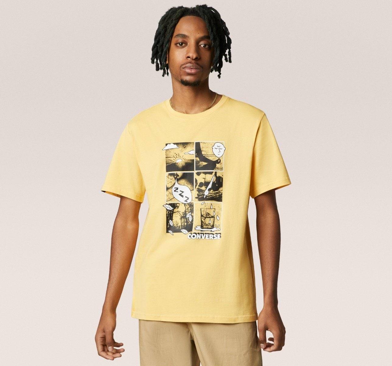Komiksowa grafika ilustruje misję Converse Renew na koszulce o klasycznym
