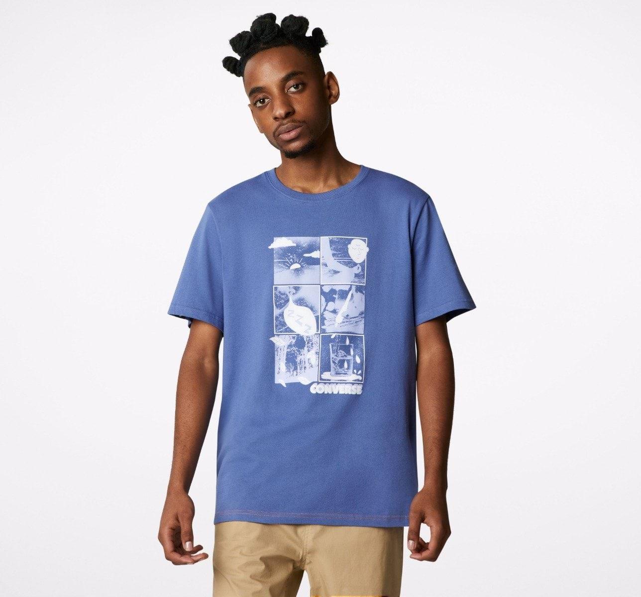 Komiksowa grafika ilustruje misję Converse Renew na koszulce o klasycznym