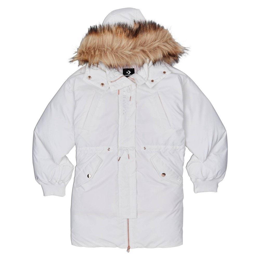 Ogrzewanie po całości, długa kurtka puchowa Converse rozciąga się do kolan.