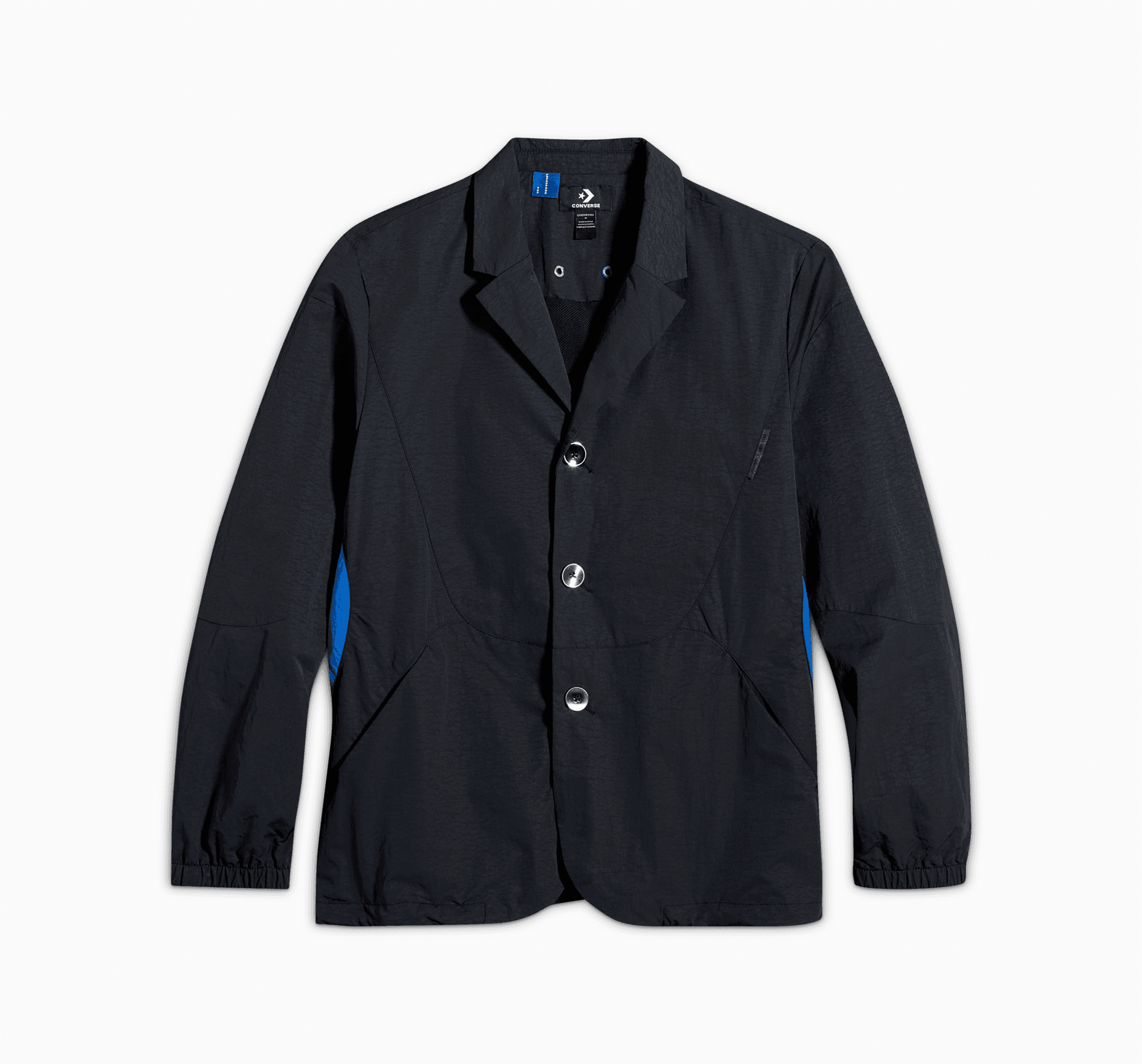 Nowa kolekcja Converse i ADERERROR zawiera marynarkę, która łączy funkcjonalne detale z podniesionym stylem. Charakterystyczny niebieski ADERERROR pojawia się obok takich elementów jak naszywka z języka buta na kołnierzu, odwrócone plisy i szwy typu zygzak.