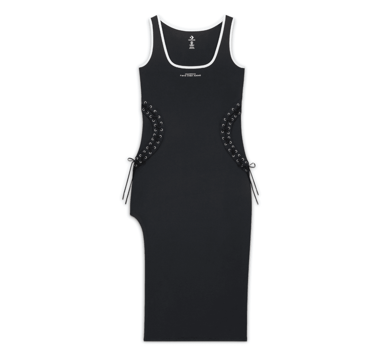 Subversive sport: Influential Chinese designer Feng Chen Wang drops a new collection of Converse apparel, reinterpreting classic garments through her signature conceptual lens. Her deconstructive approach transforms modern staples into distinctive, one-of-a kind pieces with nods to Converse sneakers. This limited-edition spandex dress with a bold side slit features cobranded silicon wordmarks on the front, metal eyelets and shoe-lace inspired drawcord knits on each side.