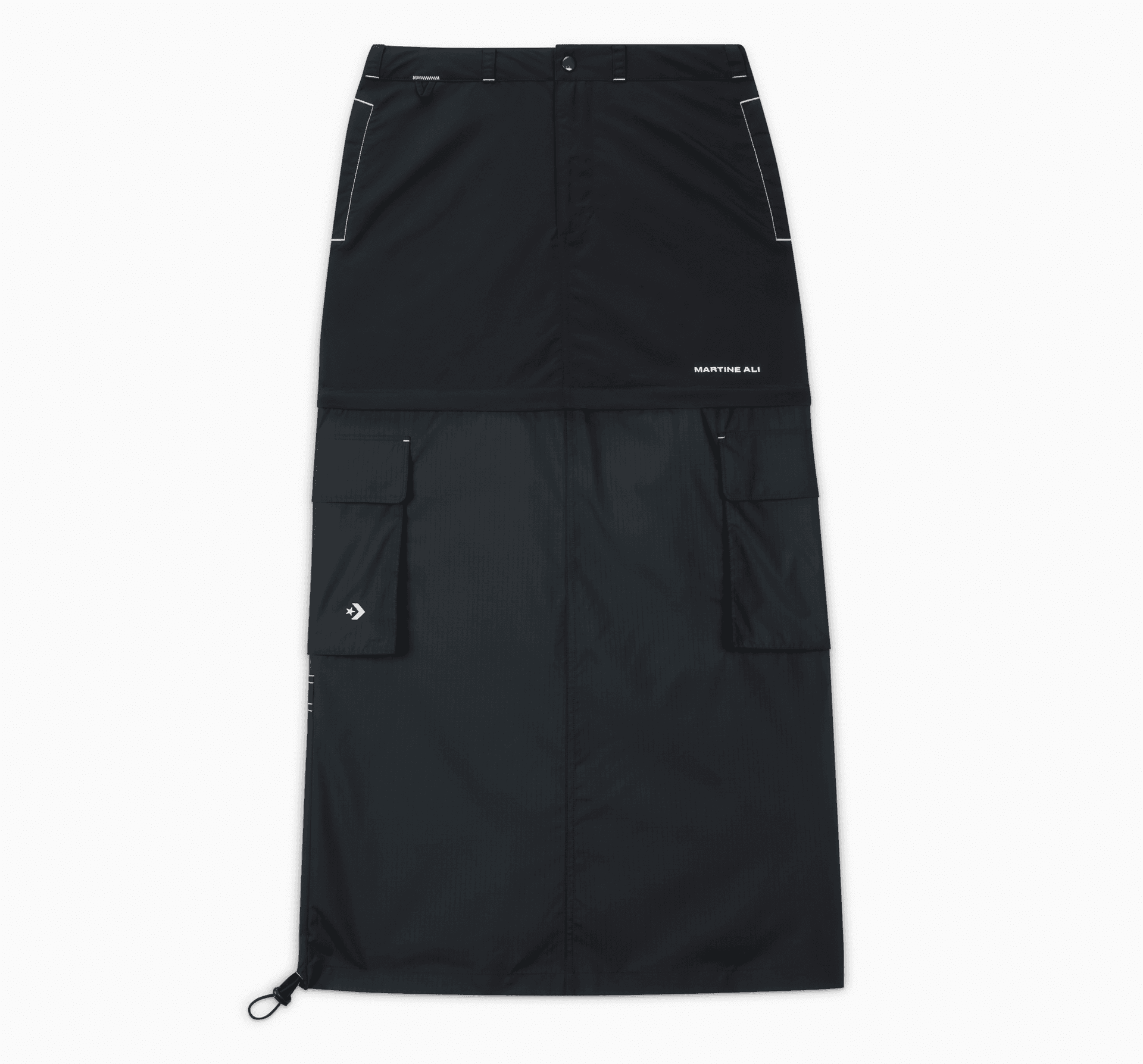 Martine Ali wnosi przewrotne akcenty do nowej limitowanej edycji spódnicy, podkreślając modułowe podejście dzięki konstrukcji z nylonu i ripstopu, którą można nosić na dwa sposoby. Dwuczęściowa spódnica jest połączona suwakiem, co zapewnia wszechstronność stylu i przemyślane detale, w tym zygzakowate i ryglowe przeszycia, unikalne kieszenie i haftowane logo obu marek.