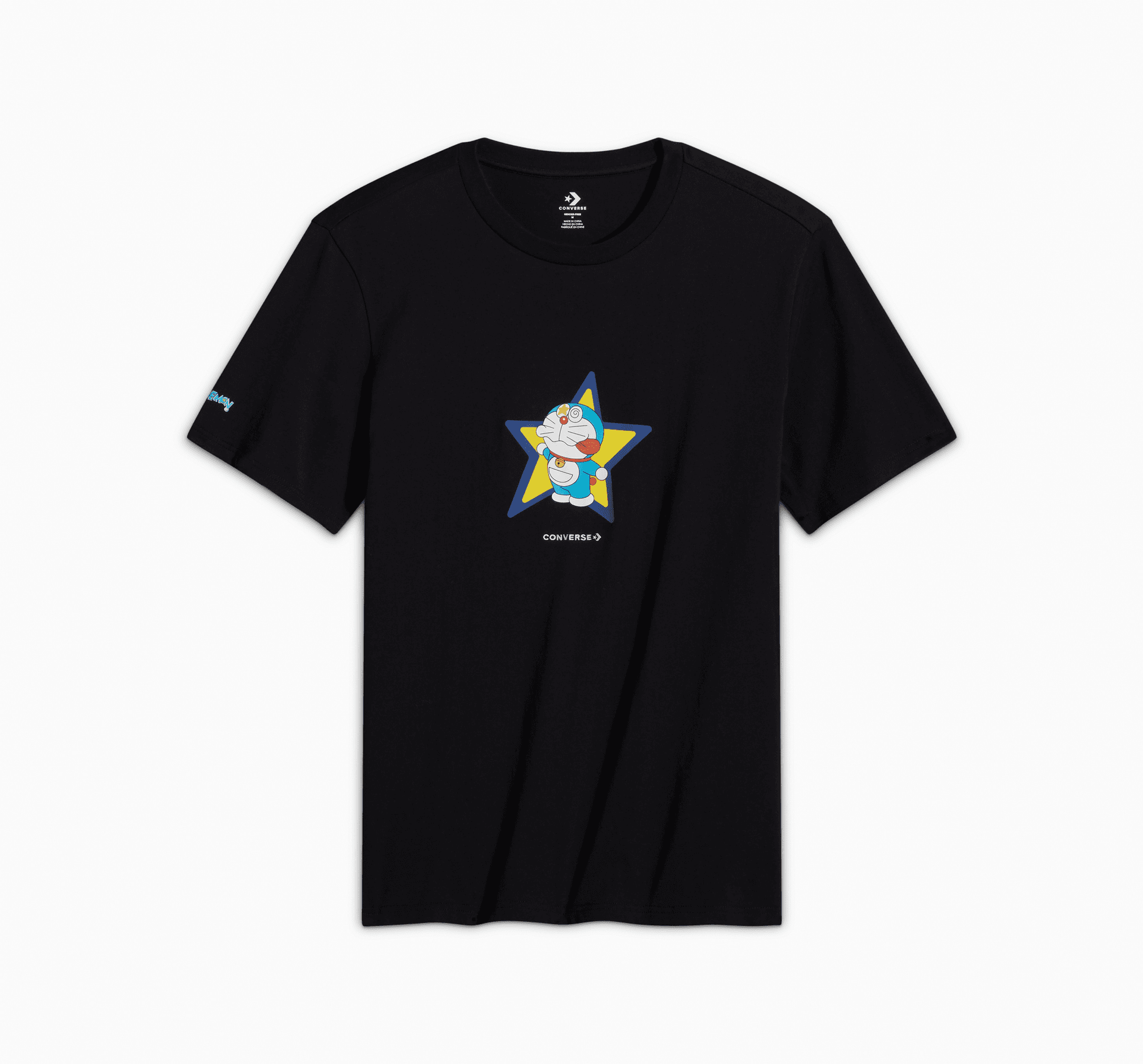 Doraemon Daze! Ta koszulka z limitowanej kolekcji ozdobiona jest dużą grafiką Doraemona i Converse na klatce piersiowej, nadrukowaną farbą gumową.