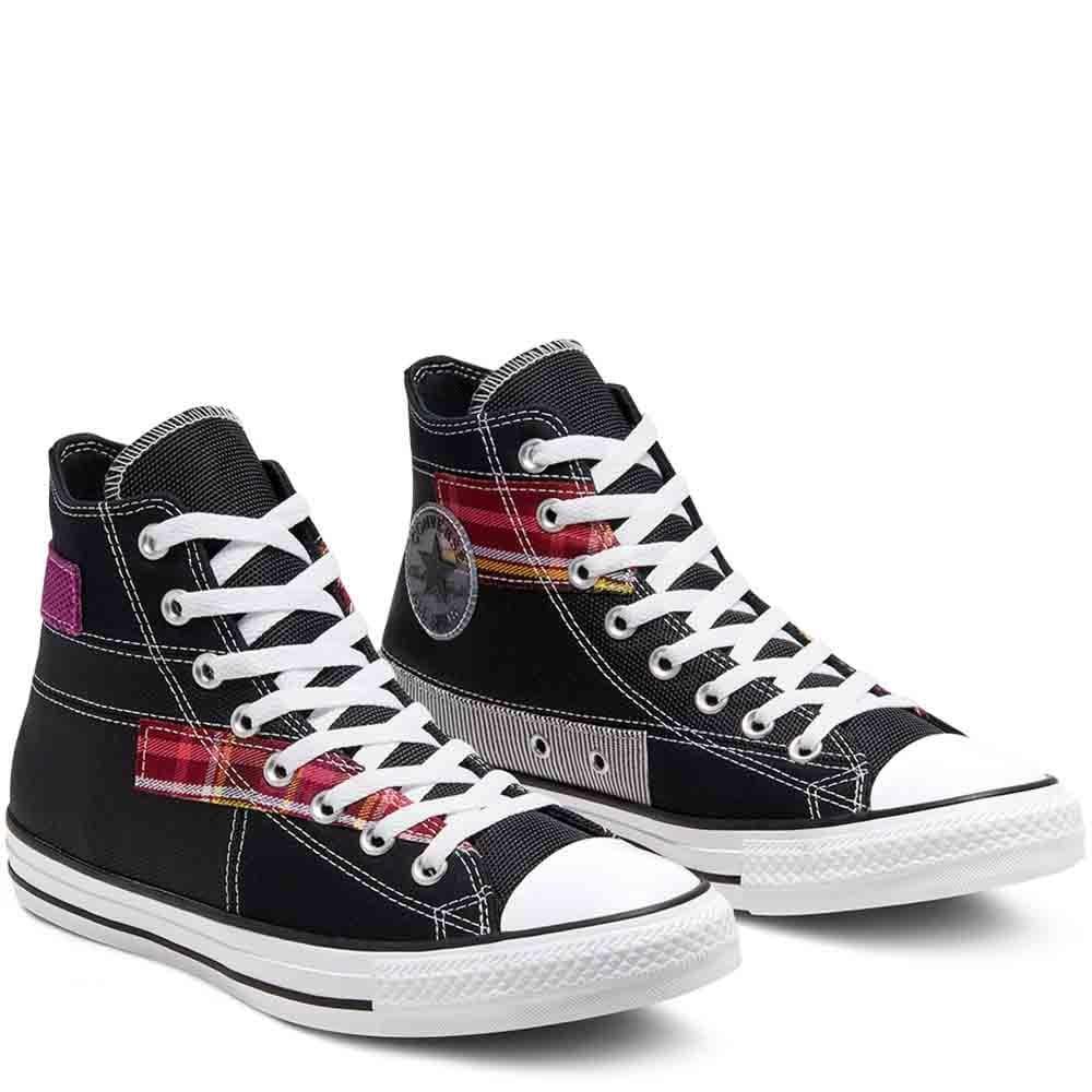 Mieszane materiały łączą się ze sobą, tworząc efekt patchworku na legendarnej cholewce butów Chuck Taylor All Star High Top.