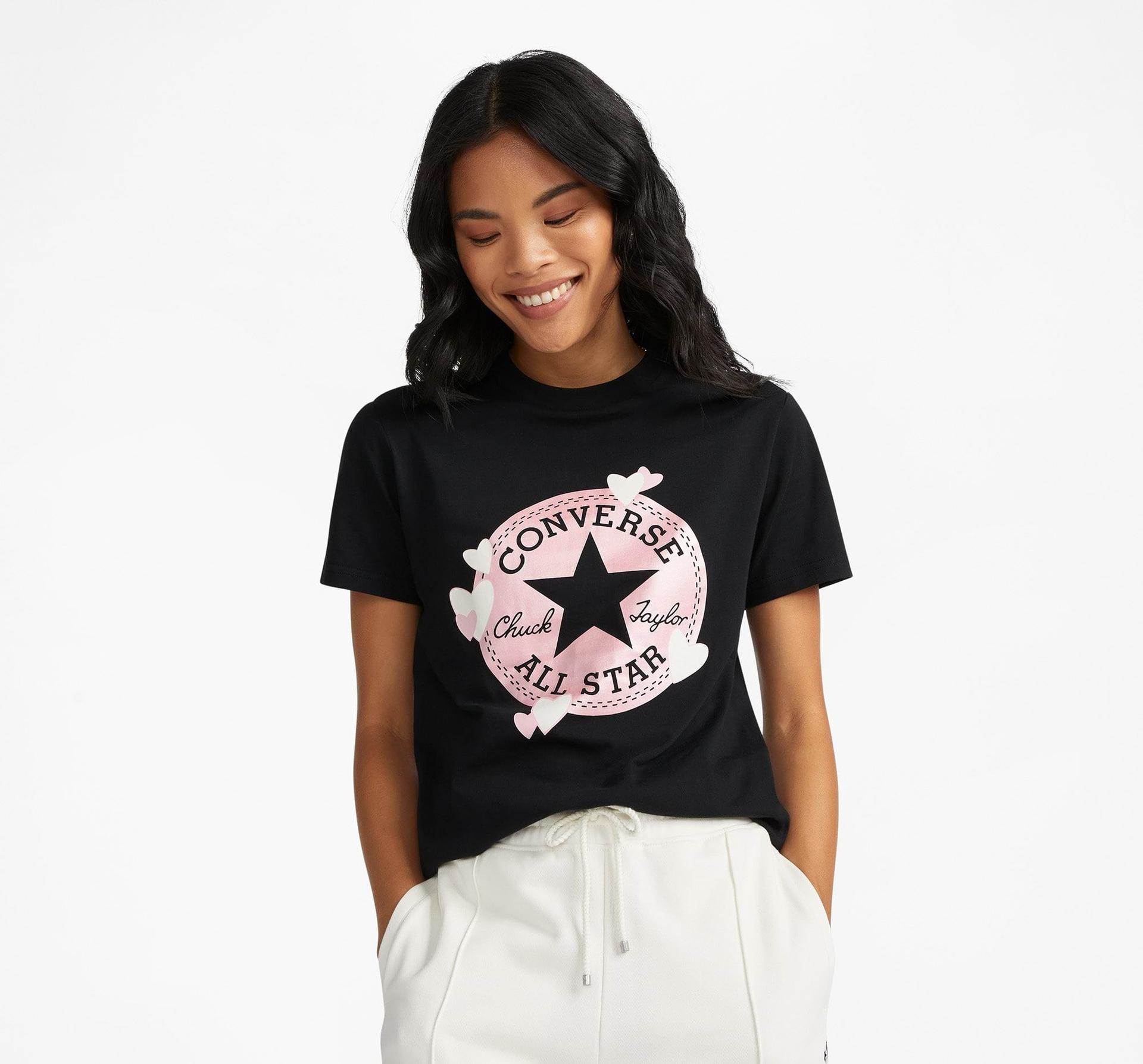 naszywce Chuck pokrytej sercami. Ponadto klasyczny okrągły dekolt oznacza,