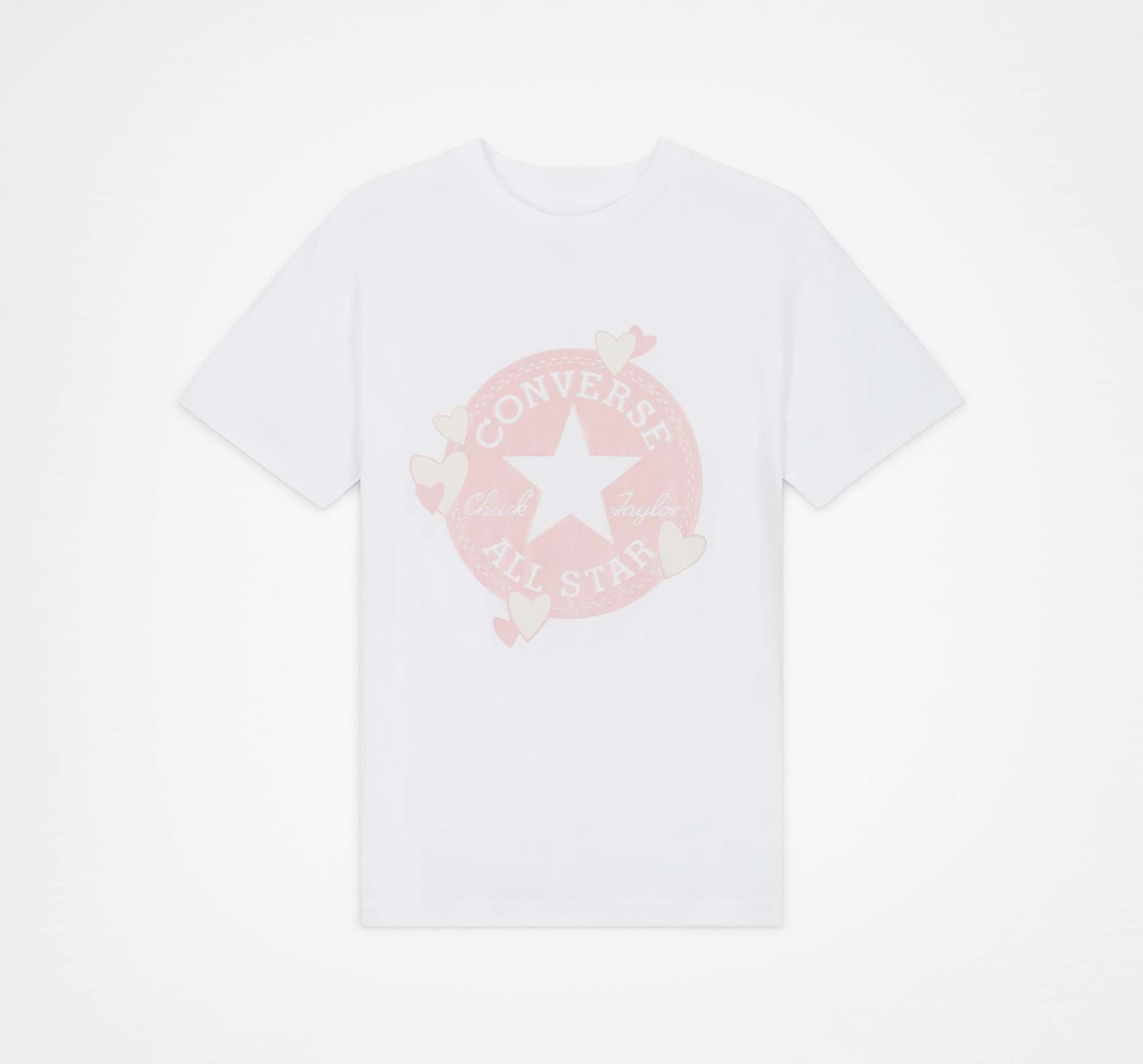 naszywce Chuck pokrytej sercami. Ponadto klasyczny okrągły dekolt oznacza,