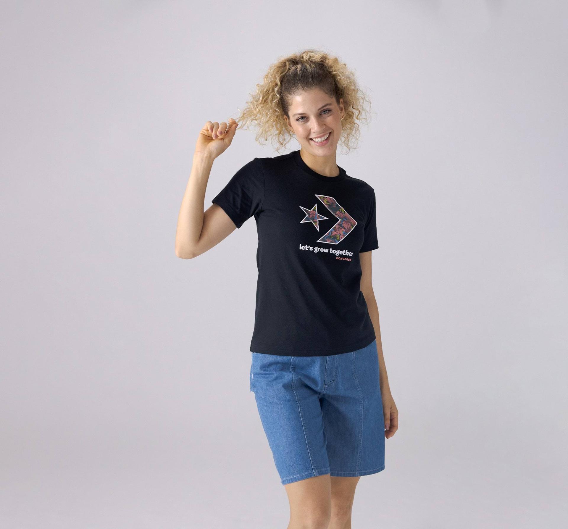 Damska koszulka o regularnym kroju dostępna w nowych, jasnych odcieniach oraz codziennych neutralnych kolorach, jest utrzymana w charakterystycznym stylu Converse. Miękka bawełniana dzianina zapewnia komfortową oddychalność, a kwiatowe logo Star Chevron oraz napis "Let's Grow Together" tworzą radosny i swobodny styl.