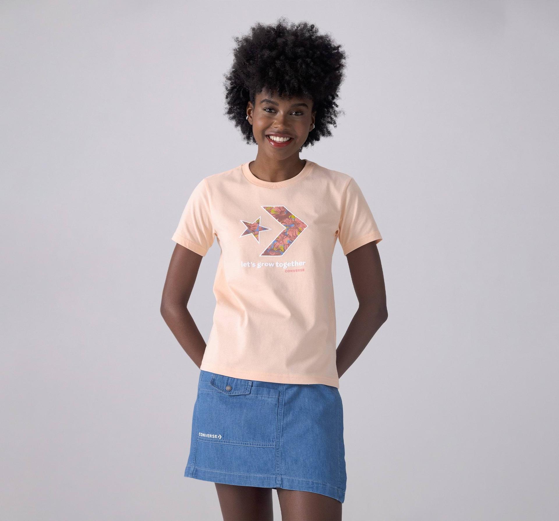 Damska koszulka o regularnym kroju dostępna w nowych, jasnych odcieniach oraz codziennych neutralnych kolorach, jest utrzymana w charakterystycznym stylu Converse. Miękka bawełniana dzianina zapewnia komfortową oddychalność, a kwiatowe logo Star Chevron oraz napis "Let's Grow Together" tworzą radosny i swobodny styl.