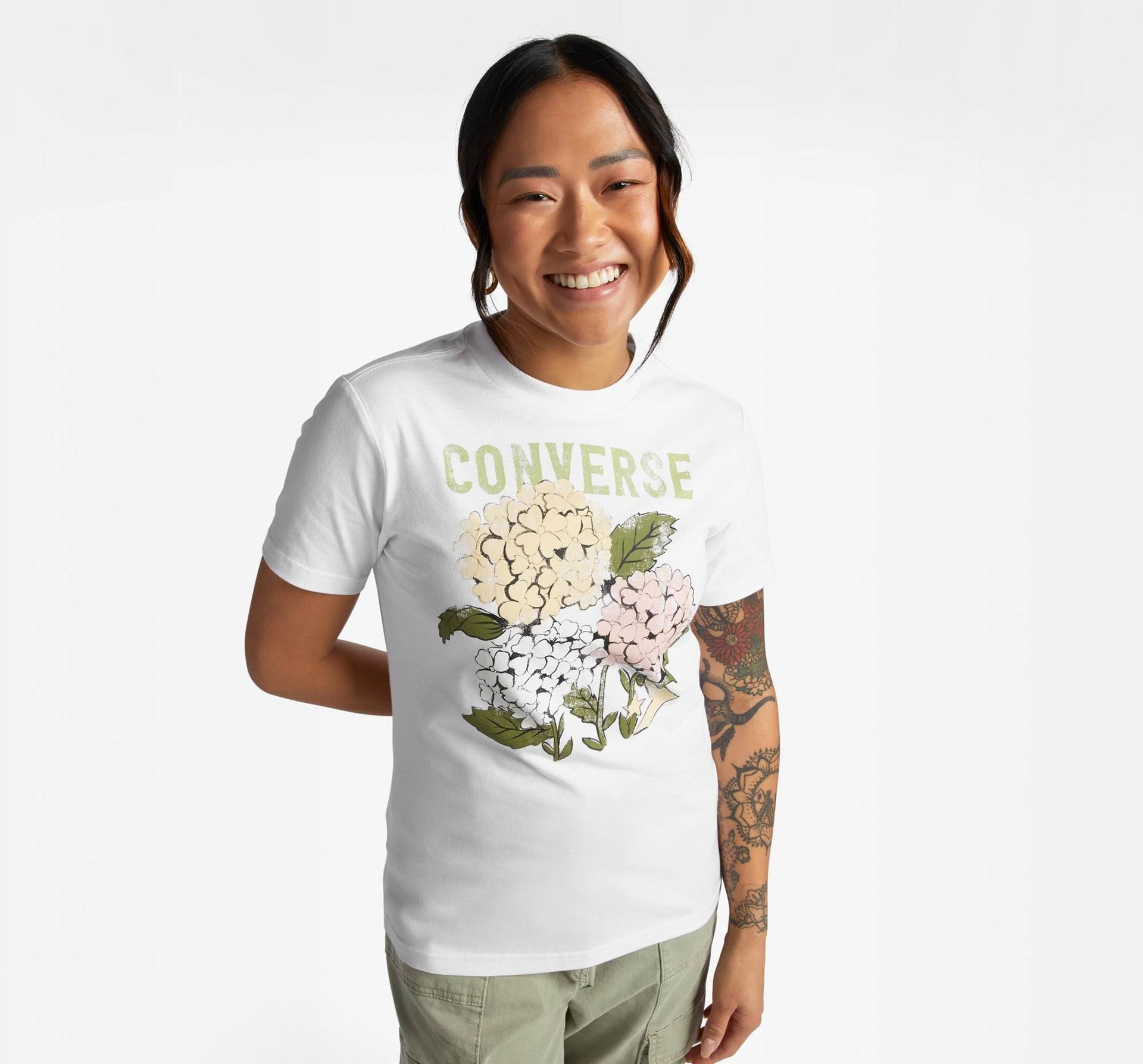 Niech Twój styl rozkwita z pomocą tej koszulki z kwiatową grafiką. Wykonana z miękkiego dżerseju bawełnianego i ozdobiona kolorowymi detalami, podtrzymuje letnie wibracje nawet gdy spada temperatura.