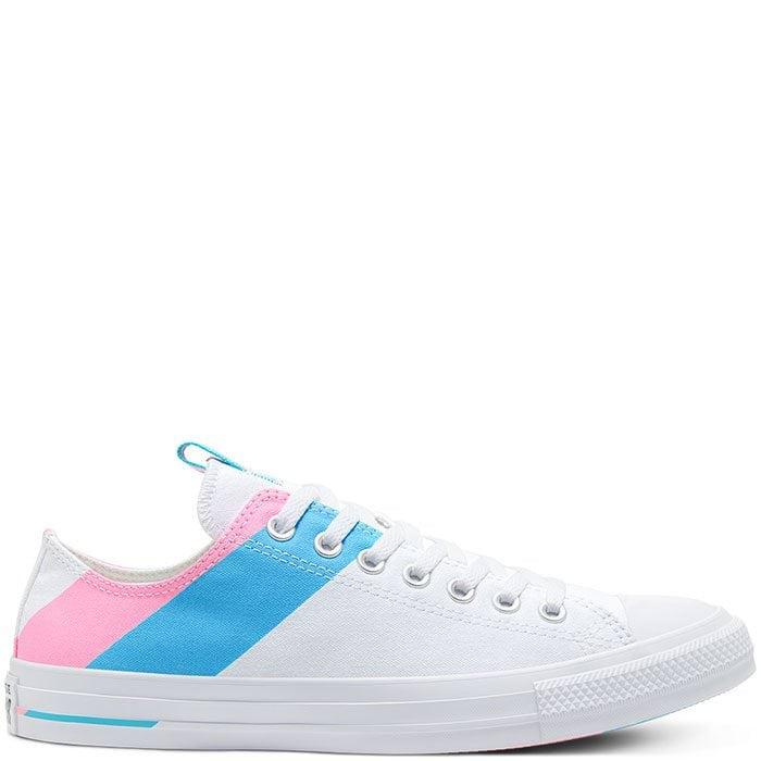 i kolorach. Niski Chuck Taylor All Star z niebiesko-różową flagą, symbolizuje wsparcie dla społeczonści trans.