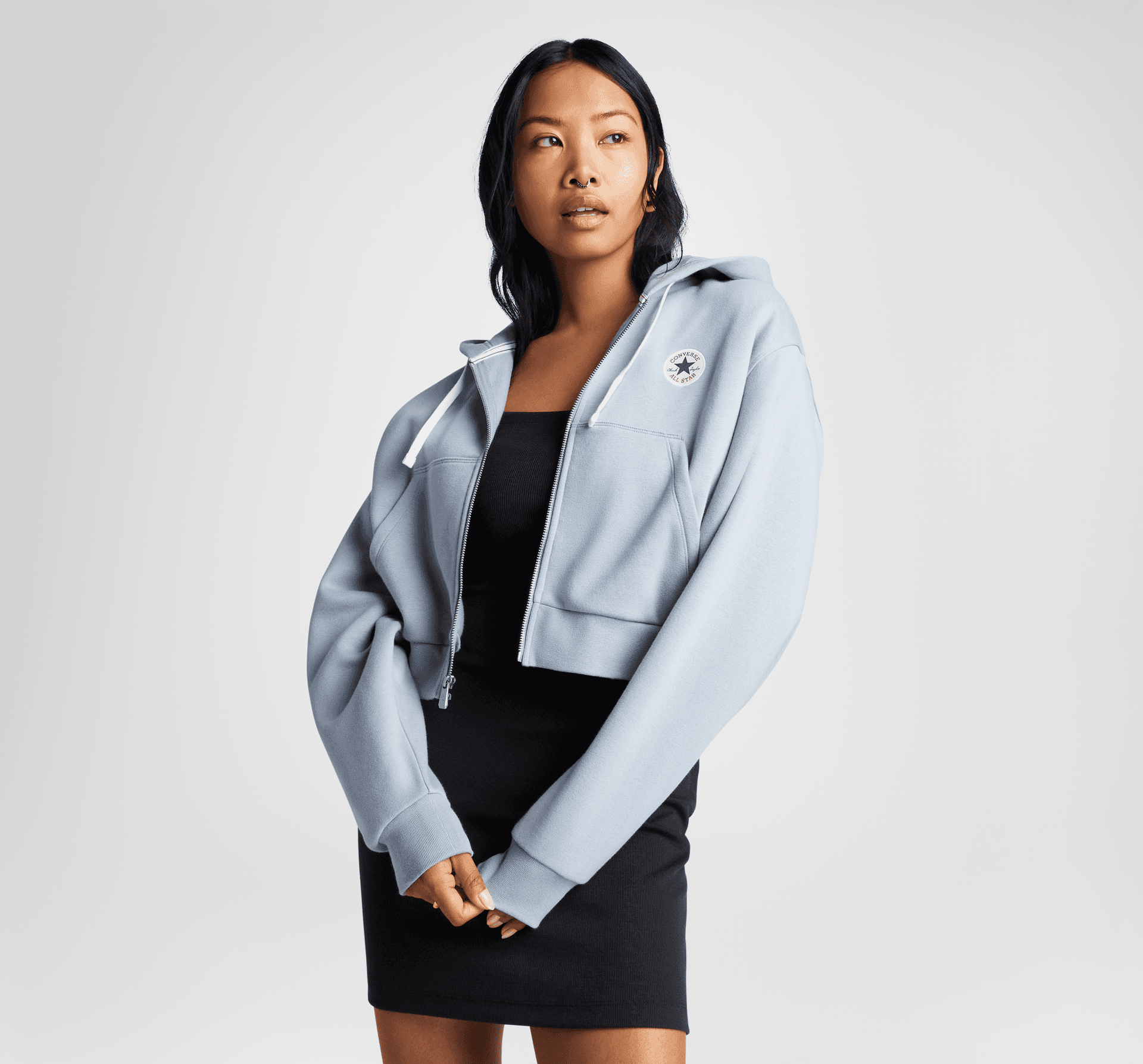 - Lekko skrócona bluza z kapturem zapinana na zamek