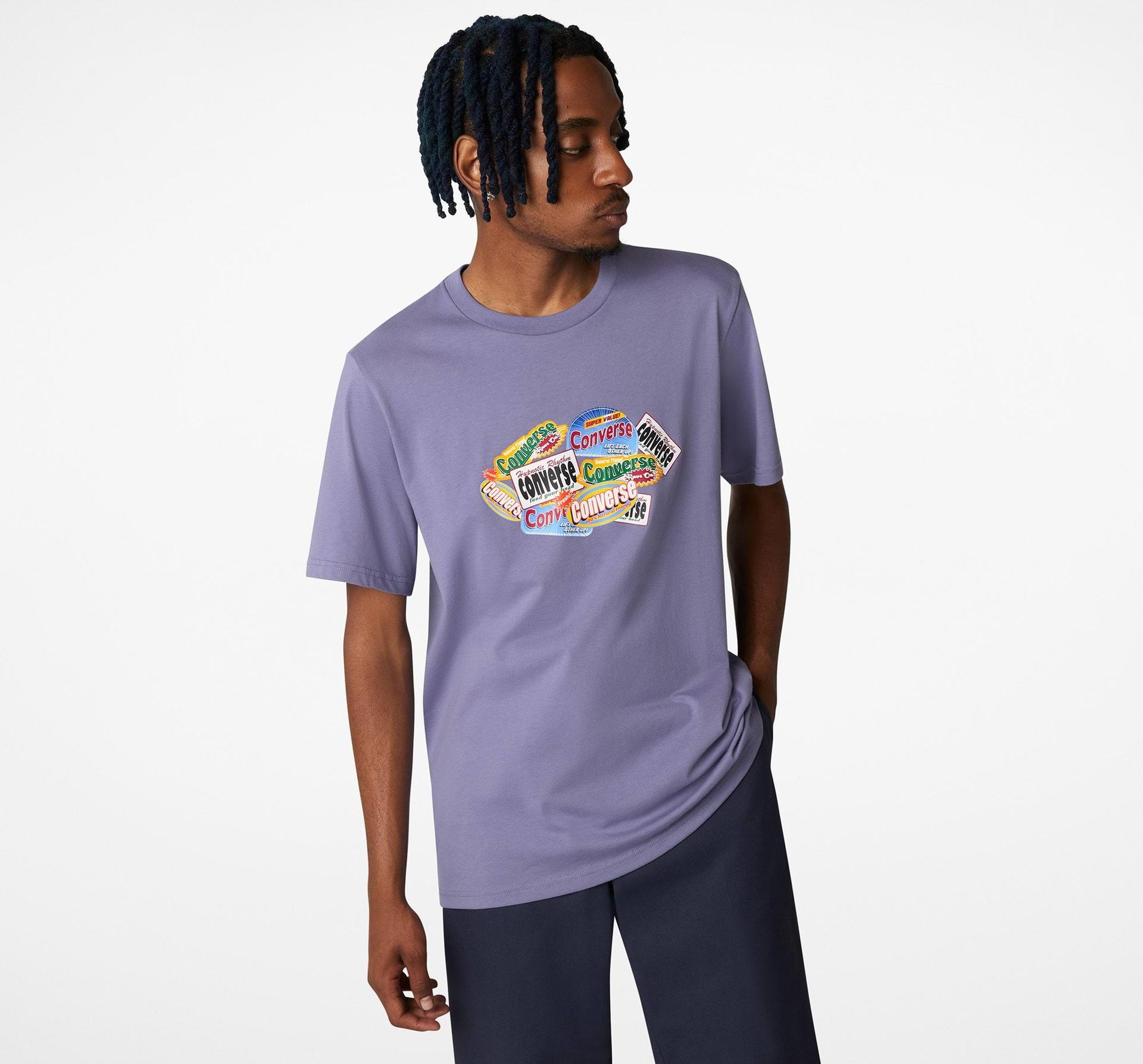 Napisy Converse pokrywające cały front koszulki połączone w formie kolażu.